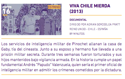 I have just learned that my film has been selected to this year’s El Ojo Cojo International Film Festival. Viva Chile Mierda will compete against 4 others for the €1,000 prize for Best Documentary Feature. But really what I am most happy about is that my Aunt Gaby and her children will be able to see the film screened in a cinema near them. The festival takes place in Barcelona and Madrid from October 3-12. Go if you can and spread the word.