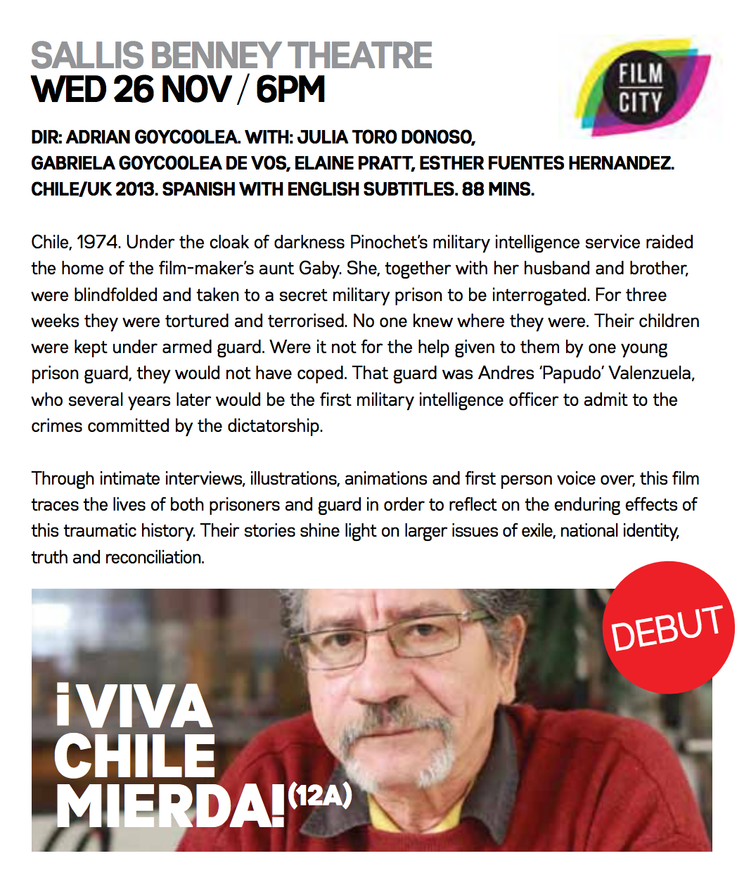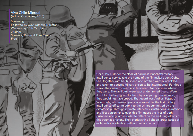 Screen Shot 2014-10-13 at 11.32.36On Wednseday I will be in Northern Ireland to present ¡Viva Chile Mierda! at the School of Creative Arts in Queens University Belfast. I am very pleased to have been invited by Professor Cahal McLaughlin to screen screen and discuss my work to their students. I have never been to Belfast before so I am greatly looking forward to this trip. This event series is open to the general public and is free so if you are Belfast you are more than welcome to attend even if you are not a student. Hopefully I will see some of you there.